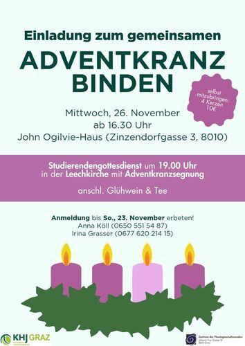 Mi 26. Nov, Adventkranzbinden ab 16.30 Uhr. Anmeldung erbeten. Infos s.u.