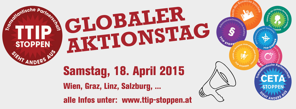 Am 18. April 2015 fand der weltweite Aktionstag gegen die Handelsabkommen TTIP, CETA und TiSA statt. Hunderttausende Menschen gingen auf die Straße und protestierten gegen Handelsabkommen, die Konzerninteressen über die Interessen von Mensch und Umwelt stellen. Auch in Wien, Salzburg, Linz, Klagenfurt, Graz, Innsbruck, Vöcklabruck, Freistadt, Wiener Neustadt, Villach und Gmunden gab es kreative Aktionen und Demos gegen TTIP, CETA und TiSA und für eine alternative Handelspolitik. Alle Infos und eine laufend aktualisierte Übersicht unter: www.ttip-stoppen.at/