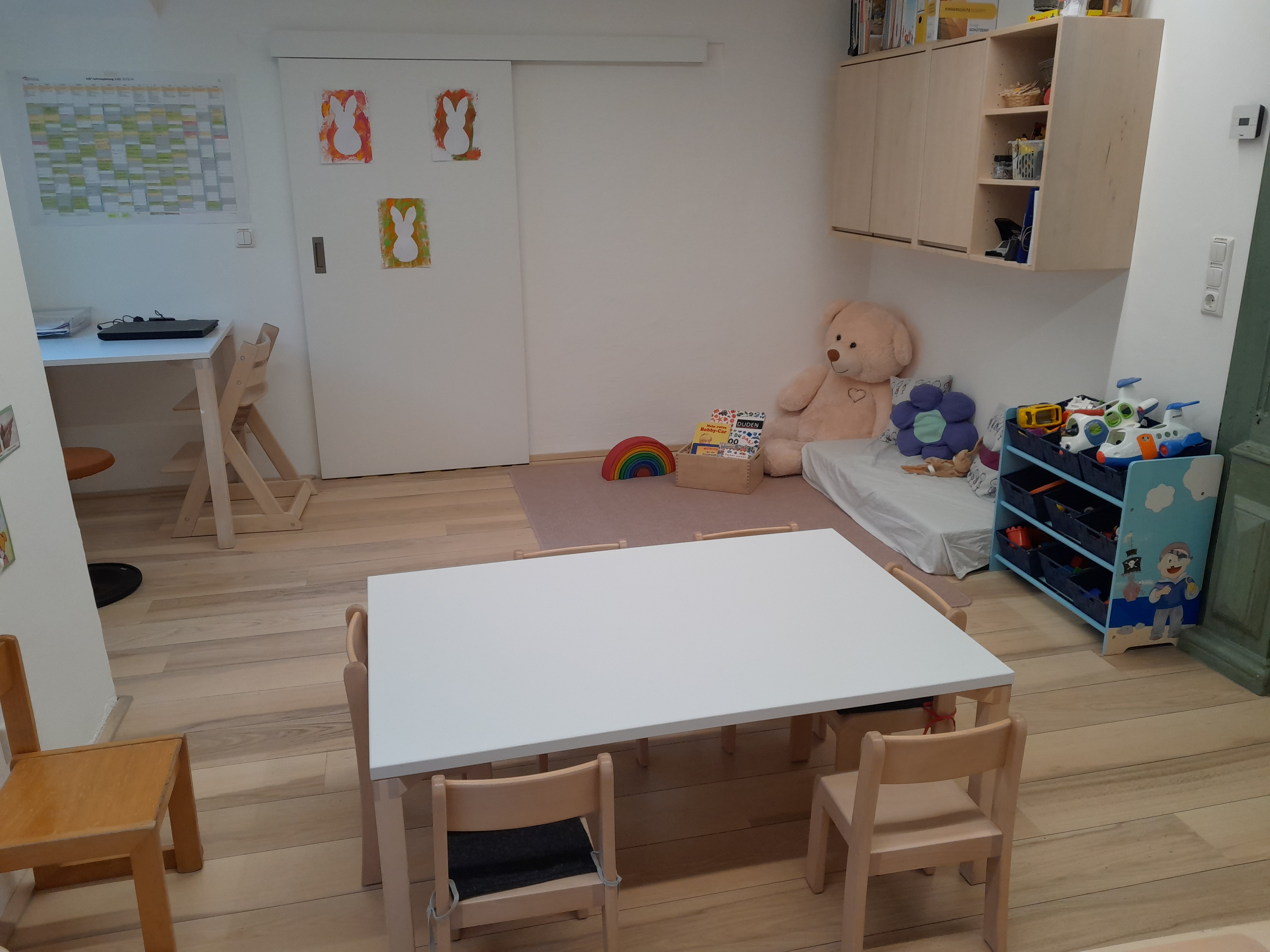 Die Kinder können die Kuschelecke zum Kuscheln und Bilderbuch anschauen nutzen. Es stehen auch einige Tischspiele, wie Puzzles, zur Verfügung. Unser Wohn- und Familienbereich bietet den Kinder die Möglichkeit mit Puppen und Kuscheltieren zu spielen sowie zahlreiche hauswirtschaftliche Tätigkeiten, wie das Kochen in der Puppenküche, auszuführen. Der Baubereich lädt zum Bauen, Gestalten und Transportieren ein.