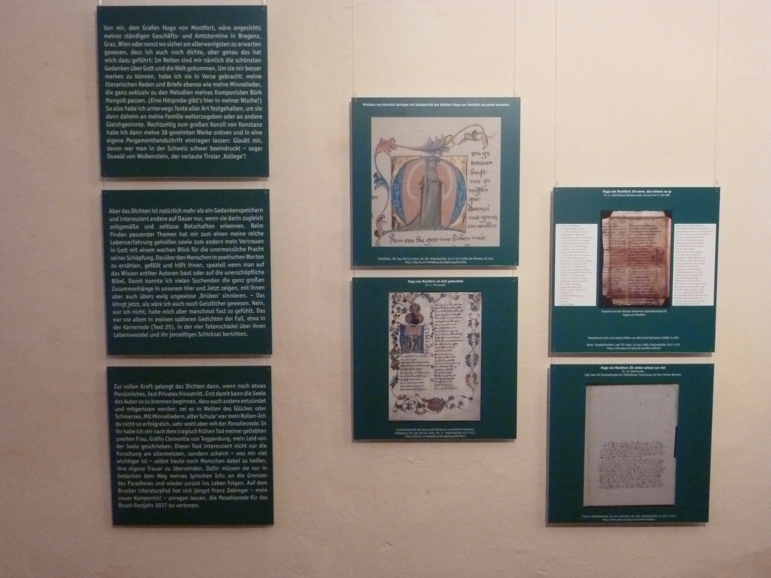 Vermutlich um 1414 – also auf dem Höhepunkt seiner Macht – ließ Graf Hugo von Montfort in Wien oder in der Steiermark jene Prachthandschrift seiner poetischen Werke anfertigen, die in der Heidelberger Universitätsbibliothek liegt: 40 Dichtungen in frühneuhochdeutscher, stark alemannisch gefärbter Sprache überliefert diese z.T. bebilderte und mit 10 Notenaufzeichnungen versehene Handschrift, aber nur die ersten 38 Texte dürften tatsächlich von Hugo stammen, denn Nr. 39 und 40 wurden erst nach seinem Tod eingetragen und weisen auf eine fremde Autorschaft hin. In den ersten 38, sicher ‘echten’ Hugo-Texten begegnet uns (in Form poetischer Reden, Briefe und Lieder) ein tief gläubiger, geradliniger Mensch, der sich von hohen moralischen Idealen beseelt zeigt und neben aller Lebensfreude auch bedrückende Erfahrungen mit Leid und Tod reflektiert.