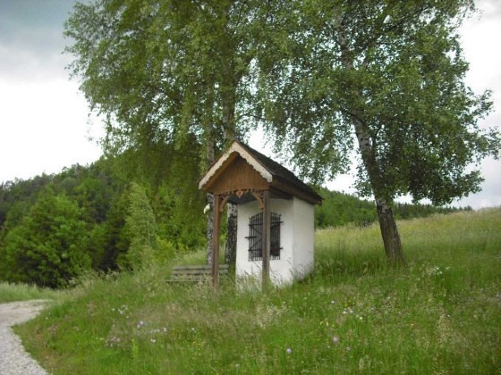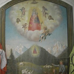Das Sigl-Kreuz besteht aus einem stabilen Steinbau und ist mit einem Holzvordach und einem Schindeldach gedeckt, das 2005 von den Besitzern komplett erneuert werden musste. Im Inneren sieht man ein Bild vom „Ursprung des wunderbaren Gnadenbildes Maria Luschariberg“. Der Luschariberg befindet sich im österreichisch-italienischen Grenzgebiet unweit der Gemeinde Tarvis im Kanaltal. Maria Luschari ist heute ein berühmter europäischer Wallfahrtsort auf einem Aussichtspunkt, der einen herrlichen Blick auf die imposanten Berge der Gegend bietet und neben dem Pilgerweg auch durch eine Seilbahn erschlossen ist. Eine alte Überlieferung berichtet, dass dort im Jahr 1360 einem Hirt die Schafe weggelaufen waren. Kurz darauf fand er sie, kniend in einem Bergkieferstrauch. Verblüfft näherte er sich und sah im Strauch ein hölzernes, reliefartiges Bild der Gottesmutter mit dem Kind Jesu. Er brachte das Bild dem Pfarrer. Doch am nächsten Tag war das Bild auf wunderbare Weise wieder am Luschariberg, und wieder umgaben es kniende Schafe. Der Fall wiederholte sich noch ein drittes Mal. Da meldete der Pfarrer die Begebenheit dem zuständigen Patriarchen. Der gab die Anordnung, dass an der Stelle, wo das Bild gefunden wurde, eine Kapelle gebaut wird. An dieser Stelle, an der heute die Wallfahrtskirche thront, wird die heilige Maria als „Königin Europas“ verehrt.