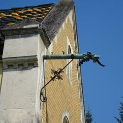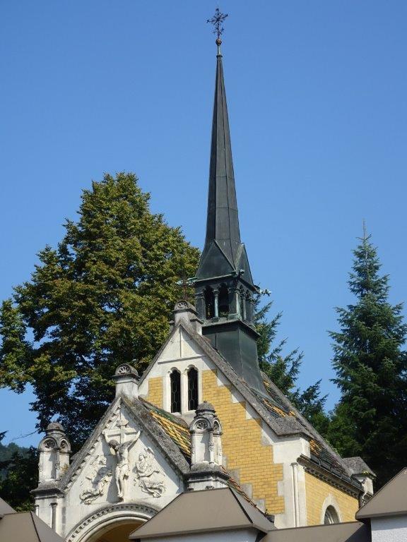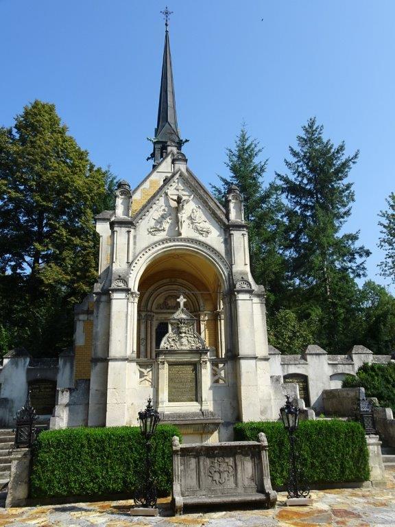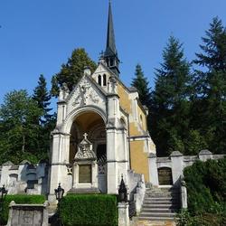 Die 1898 fertig gestellte Grabkapelle zählt wohl zu den schönsten Grabmonumenten und befindet sich am Areal der Mayr-Melnhof`schen Familiengruft im östlichen Bereich des Ortsfriedhofs in Adriach. Dieses für die Gruft und den neuen Friedhof der Pfarre Frohnleiten benötigte Grundstück hatte Freiherr Franz Mayr von Melnhof der Gemeinde gestiftet. Auftraggeber der Gruft war Franz III. Freiherr Mayr von Melnhof (1854 – 1893), Guts- und Werksbesitzer, Gründer der heutigen Kartonfabrik in Frohnleiten und Landtagsabgeordneter. Nach seinem frühen Tod 1893 wurde er als Erster der Familie darin beigesetzt. Dieses schöne Zeichen des Glaubens befindet sich am hinteren Ende des mit Zinnen bewehrten, ummauerten Bereichs und ist über flache Freitreppen erreichbar. Die Kapelle besteht im Kern aus einem einfachen Baukörper mit quadratischem Grundriss und Pultdach. Die Mauern sind mit ockerfarbenen Tonfliesen aus den Wienerberger Ziegelwerken verkleidet. Das Dach ist von einem hohen Dachreiter bekrönt, einem Aufbau aus Metall, der mit einer Glocke ausgestattet und mit auffälligen glasierten Ziegeln gedeckt ist. Dem Eingang der Kapelle ist eine niedrigere, steinsichtige Vorhalle vorgesetzt, die sich nach drei Seiten in runden Bögen öffnet. In die Brüstung ihrer Stirnseite ist eine wappenbekrönte Tafel eingelassen, die mit rührenden Worten an den verstorbenen Erbauer erinnert: „Das schönste Los ward ihm auf Erden, Im Giebelfeld der Grabkapelle prangt eine Skulptur des gekreuzigten Christus, flankiert von Engeln. Mit dem spitzen Türmchen und den hohen Giebeln, dem reichen Skulpturenschmuck bis hin zu den monsterhaften Wasserspeiern erinnert das Bauwerk an die Architektur der Gotik. Der Zugang erfolgt durch die Priestergruft, eine aufwändige Säulenhalle mit drei großen Bögen. Dort fanden die in Frohnleiten verstorbenen Servitenpatres und der verdienstvolle Obmann des „Vereins der Freunde der Kirche Adriach“, OSTR Msgr. Johannes Parizek (1915 – 1996), ihre letzte Ruhestätte. Johann Melinz |