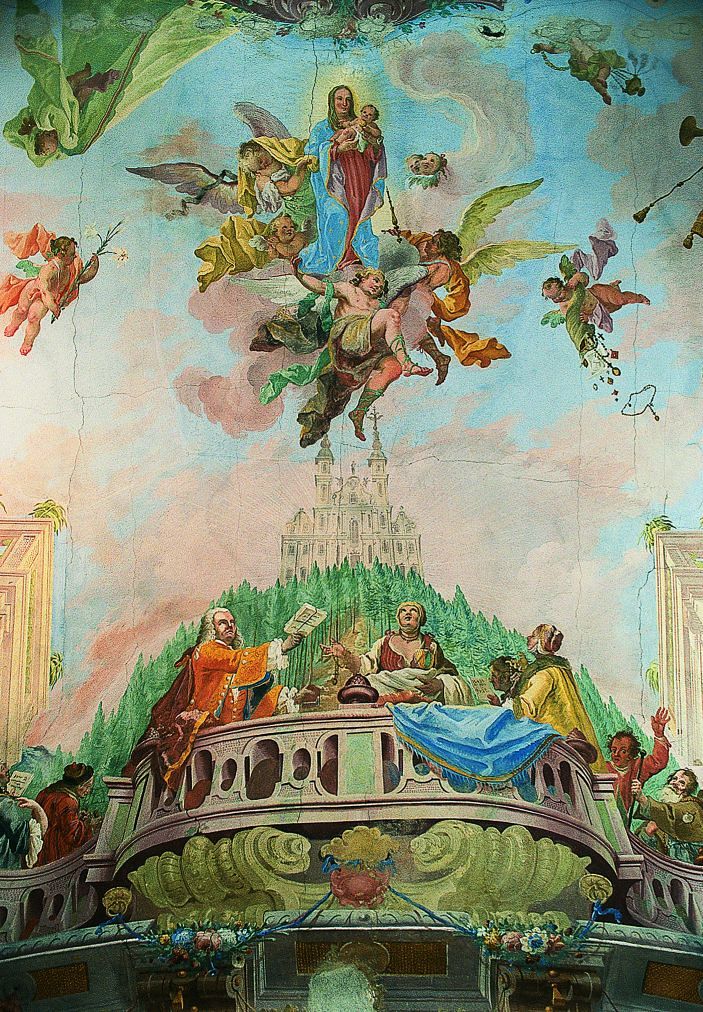 Im ersten Stock des Osttraktes, direkt hinter dem Hochaltar, im Vorraum zu den Oratorien befindet sich das sogenannte Stifterfresko. Das Fresko wurde von J. B. Scheidt 1747 gemalt und zeigt den Stifter des Gnadenortes Conduzzi mit einer Frau an einer Balkonbrüstung stehen. Sie übergeben die Stiftungsurkunde der von Engeln umgebenen "Mariatroster Madonna", die über ihnen schwebt. Im Hintergrund erhebt sich in einer Art Vision die strahlende Kirche Mariatrost.