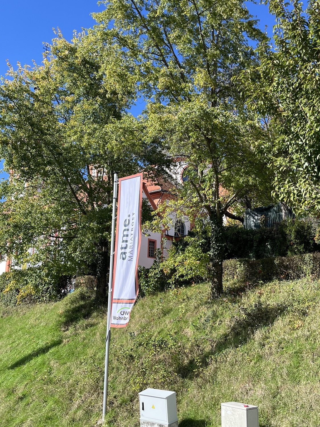 Mit einem Gedankenimpuls laden die Fahnen die Besuchenden zu einem vielfältigen Erleben von MARIATROST ein.