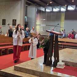 Gesegnet und gestärkt konnten die Gottesdienstbesucher:innen das neue Schul- und Arbeitsjahr beginnen. Alle Kindergarten-, Schultaschen, Unirucksäcke, Laptoptaschen...und Koffer wurden mit ihren Besitzer:innen mit dem Segen Gottes und dem Wissen "Ich bin nicht allein" begleitet. Als Erinnerung daran wurden kleine Segens- und Stärkungssymbole verteilt. Tina Schörgi lud alle ein wieder mehr zu segnen, was jede und jeder darf, und den Mitmenschen Gutes zu wünschen: durch ein Kreuz auf die Stirn beim Gute Nacht sagen, beim Anschneiden eines Laib Brotes, beim Abschied mit Weihwasser.... Alle Kinder erhielten kleine Weihwasserfläschchen und die Erwachsenen die Erinnerung, dass wir "Gott befohlen" sagen, wenn wir "tschüss" sagen, das vom französischen a dieu kommt oder "God be with you" beim Gruß "bye, bye". Ein gemischter Chor hat die Feier wunderschön musikalisch gestaltet.