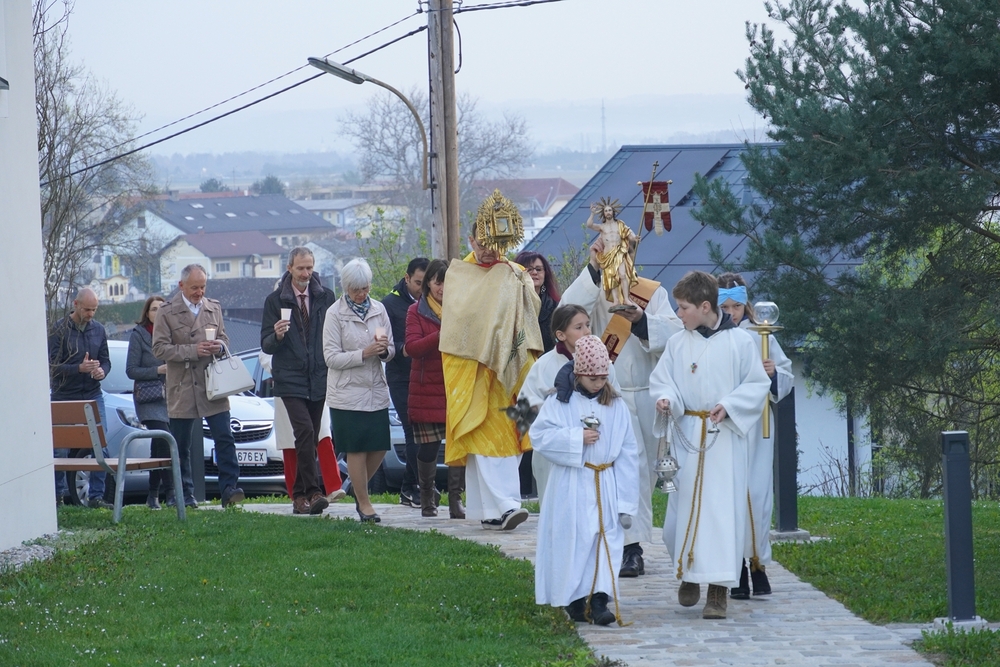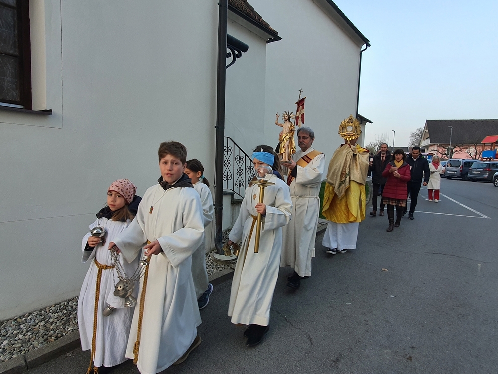 Mit Rosenkranzgebet und den Klängen der MUZ erreichte die Prozession schließlich den Kirchplatz, wo sich beim Altar vor dem Kreuz ein wunderschöner Blumenteppich befand, den die Minis am Vorabend mit großem Eifer gestaltet hatten. Diese „Augenweide“ wurde von vielen bewundert, auch von den mitfeiernden Gästen aus Wundschuh.